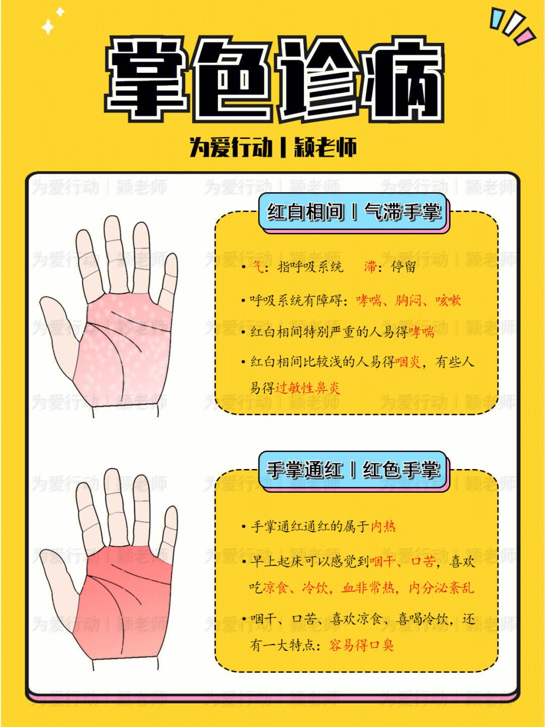 1、手掌红色为内热掌脸红手红没事,脸白手红,经常胸闷气短口臭口苦口干烦燥不安,好饿好冷饮,是内分泌失调如糖尿病好出现红色掌女士例假期好出现此掌色如果是红白相间的话是气滞掌这样的人易感冒咳。