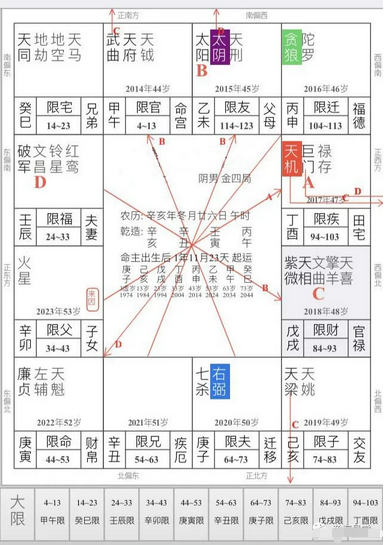武杀在酉,个性刚强顽固,做事斩钉截铁庚年武曲化权,更加重权威性质,控制占有欲望强烈,与羊铃同宫更增加急躁暴烈的性质,命身同宫也是固执的表现福德空宫,对宫廉贪空劫,做事欠考虑,易冲动,盲目。