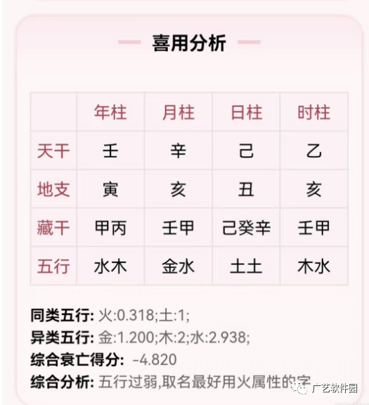 然后通过分析这个宝宝的四柱八字起名五行排盘,比如如果五行木旺缺火那么久判断出这个宝宝的八字喜“火”,起名要补火根据五行喜忌寻找适用的字为宝宝起名接下来就是根据数理平衡的关系,寻找笔画数比较合适的,通过。