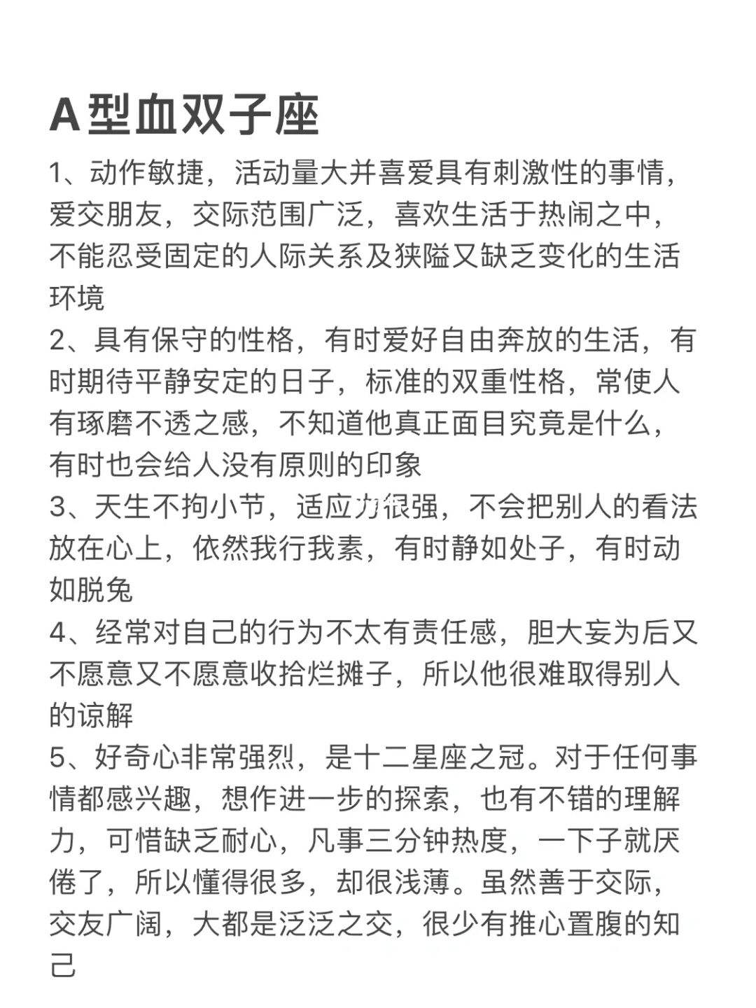 2、双子座是双面人,具有双重性格好玩好动好奇,使双子座像一枚跳动不休的火焰,时强时弱,却永不熄灭他们聪慧过人,口才极佳,很有创意思维,但是却是很情绪化的人,时而快乐奔放,时而又有点忧愁诗人的气质,与双子;双子座性格分析1 双子座 5月22日6月21日 优点 适应力强机智敏捷喜欢忙碌和变化主动活泼而健谈聪慧且多才多艺具有写作和语言方面的天才对时尚有着敏锐的感受力,能够永久维持着年轻和时髦的外貌缺点;缺点 怀疑心重善变双重性格缺乏耐性狡猾不安份过人的精力未能发泄时则 脾气暴躁且喋喋不休 性格 双子座是所有星座中最能保持青春和活力的星座,他们经常都处于行动的状态,而 且往往同时进行好几件事情,天;下面就随着小编去看看双子座性格特点分析吧双子座双子座是什么性格 聪明伶俐 双子座的人聪明伶俐,性格多变,内心总是闪耀着美好欢乐幸福爱情和理想的火花他们爱玩,内心充满幻想,身边总是有数不尽的朋友,平时;一双子座的性格优势 双子座是一个喜欢主动的人,遇到喜欢的对象,他们会毫不犹豫的出手所以他们在恋爱的时候很容易主动此外,双子座的人往往拥有有趣的灵魂,这导致他们在生活中善于交际,在与人相处时也容易给人带来。