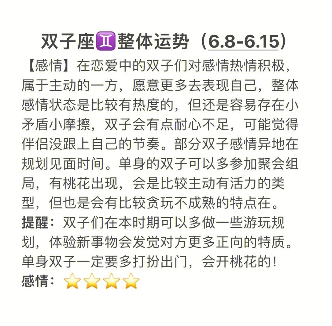 1、钱财分析双子座好有的头脑容易带来财富,对钱财的态度相当灵活,个人的成就感大于对财富的拥有感双子座男生性格 双子座男生是一类迷人的和有些异想色彩的人,他们从容不迫,和蔼可亲,常给人以永远是局外人的印象他们;实际上这来自于他们对自己的不信任,对道德的不信任,对一切的好奇和怀疑双子座不是多动儿童,他们是自闭我敢打赌对双子来说,一个人独处比和朋友在一起幸福他们善于笼络人心,可是双重性格又在挑出别人的软处,弱点;他们对工作认真,对朋友有情有义,有上进心和目标他们从来不惧怕明争暗斗,因为求胜心旺盛的他们从来不会输双子座有两个比较极端的性格,开朗大方的时候对谁都会很热情,心情不好的时候就会冷漠到极致他们不管面对什;双子座具有传播和表演的天份,在语言能力上也有很不错的才能在团体中,双子座会因为能言善道社交手腕高明,而容易成为风云人物,‘见人说人话,见鬼说鬼话’也算是他们独特的绝活双子座具有外交家的天性,具有优雅的。