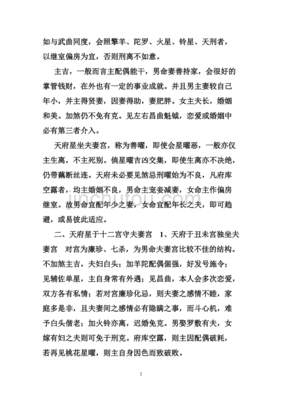 天府星在夫妻宫。男人是主智慧的妻子,他得到妻子的帮助。如果天府星陨落,或者遇到羊、度母、火星、铃星、空劫,主就会宠坏我的妻子,杀死她的第二任妻子。运气好的话,虽然老婆分居了,但还是意味着分离,比如决裂,因为天府是廉洁少刑之星。女人要求上帝给她一个有感情、英俊、有前途的丈夫。丈夫的体格大多威严而肥胖。若与武曲同度,则依羊、首陀罗、火星、铃星、天道而罚,顺室而行为宜,否则罚不尽如人意。